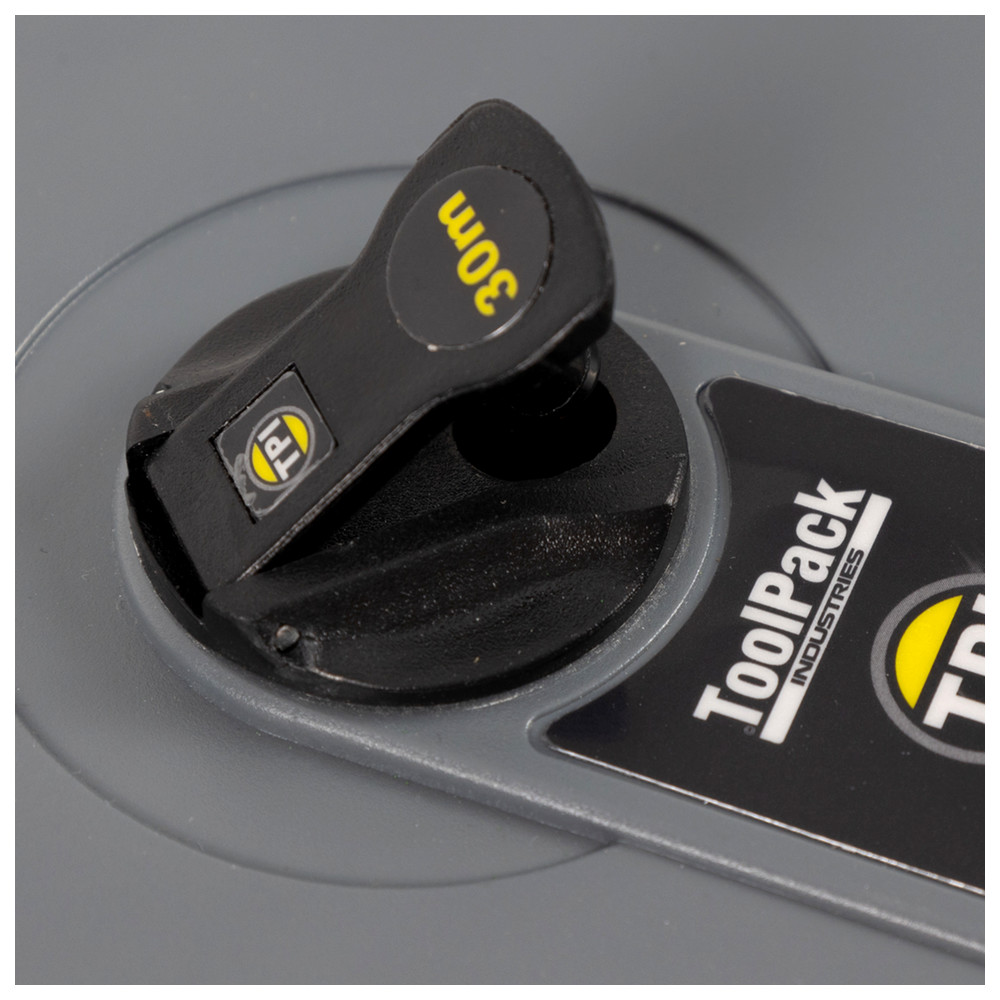 - geschlossenes Rund-ABS-Gehäuse mit Anti-Rutsch-Ring für zusätzlichen Halt und kompakten Metallgriff für einfaches Rückspulen