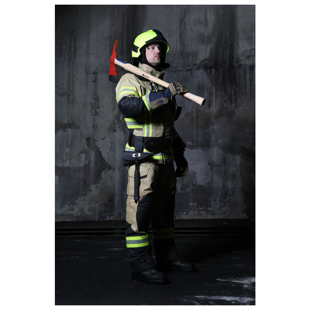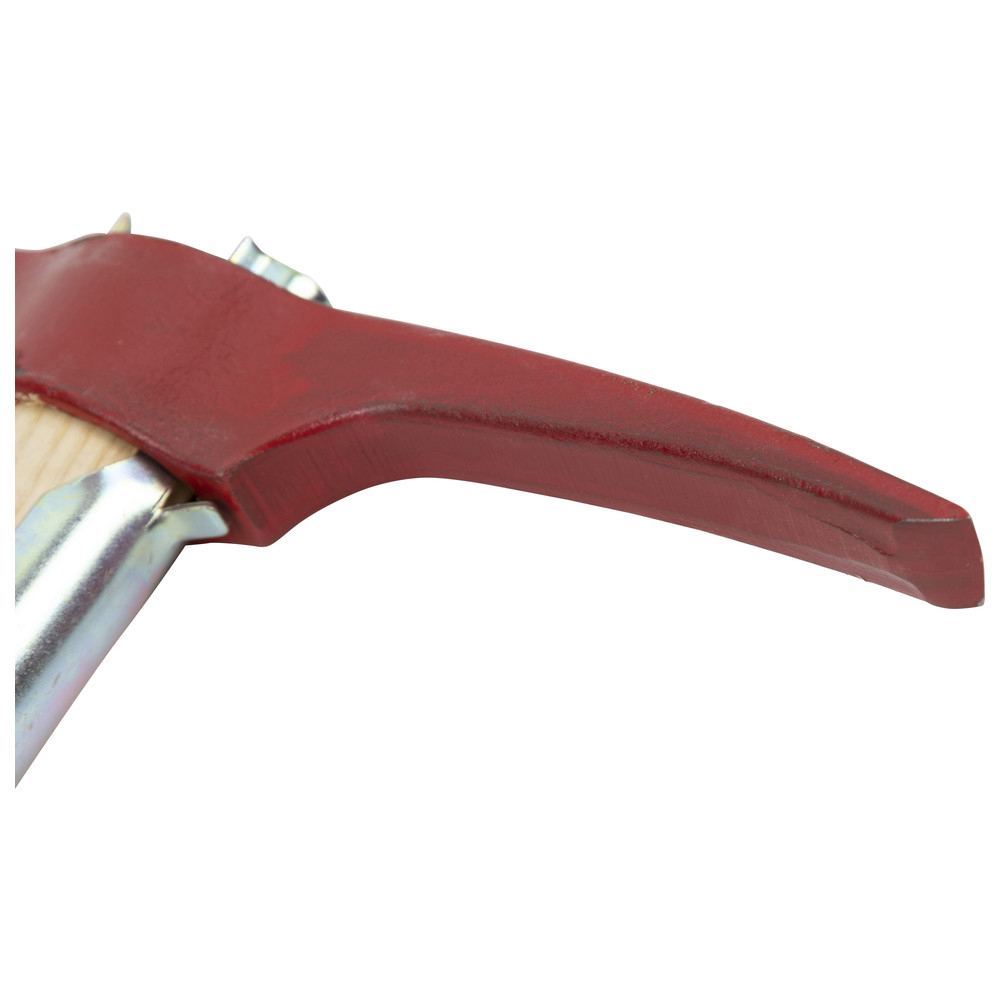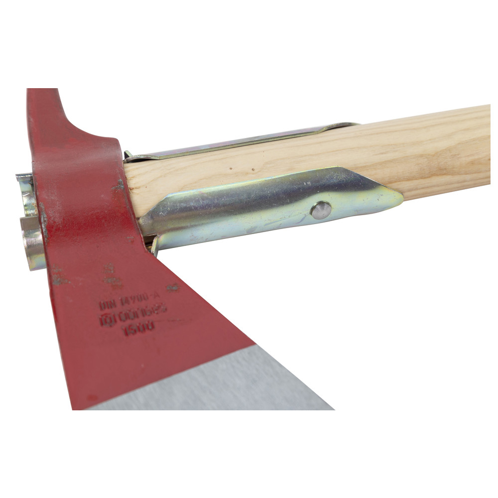 Mit ovalem, farblos lackiertem Stiel aus Eschenholz. Der Axtkopf ist mit zwei Federn, einer Niete sowie zwei Ringkeilen gesichert.