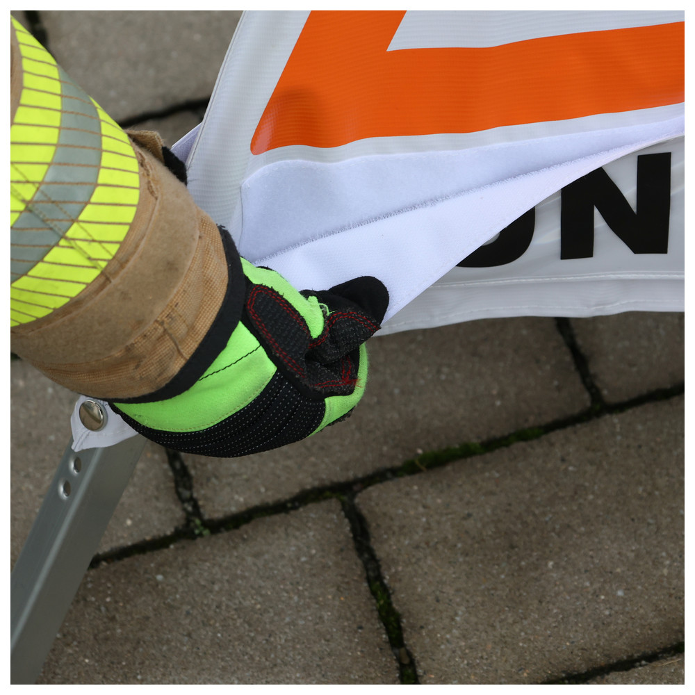 Vorteil: die Faltsignale können flexibel eingesetzt werden. Einfach das Klettschild mit der benötigten Aufschrift anbringen - fertig. Sie benötigen nur ein Faltsignal und sind für alle Fälle gerüstet. Die passenden Klettschilder gibt es mit vielen Standard-Texten. Auf Anfrage sind sie natürlich auch mit Druck nach Ihren individuellen Wünschen lieferbar. Die Klettschilder sind nur in retroreflektierender Ausführung erhältlich.