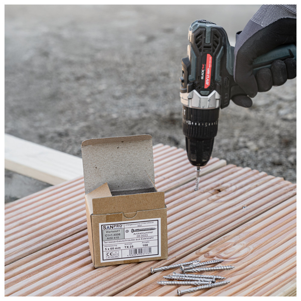 Die Terrassenschrauben der Marke Sanpro® eignen sich als Hartholzschrauben hervorragend für den Holzbau, zum Beispiel im Rahmen des Terrassenbaus oder Garten- und Landschaftsbaus. Dank des Senkkopfes lässt sich die Terrassenschrauben vollständig im Material versenken, während die Fräsrippen unterhalb des Schraubenkopfes dafür sorgen, dass das Holz beim Einbohren möglichst geschont wird.
