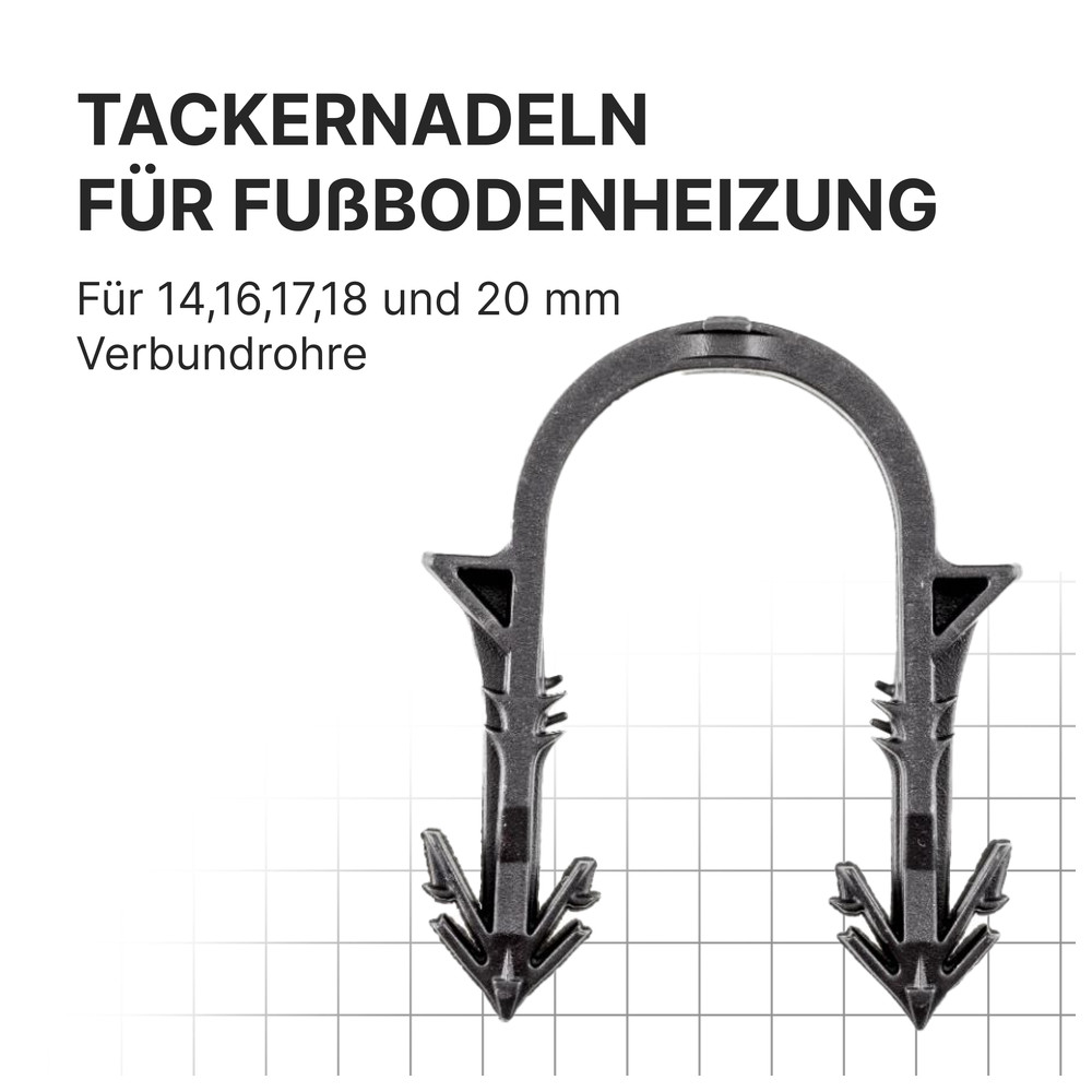 - Premium verklebte Tackernadeln EU-NORM (DIN 1264-4) für 14, 16, 17, 18 und 20 mm Rohre / Verbundrohre zur Montage von Fußbodenheizungssystemen.