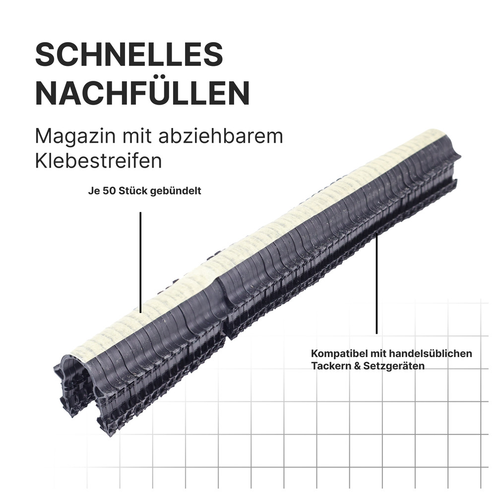 - Magazin, mit entfernbarem Klebestreifen, zu je 50 Stück zusammengefasst zum schnellen Nachfüllen des Tackers.