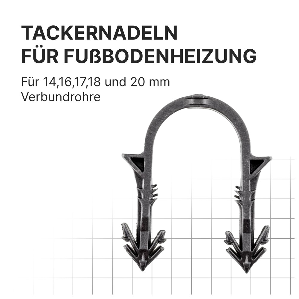 - Premium verklebte Tackernadeln EU-NORM (DIN 1264-4) für 14, 16, 17, 18 und 20 mm Rohre / Verbundrohre zur Montage von Fußbodenheizungssystemen.
