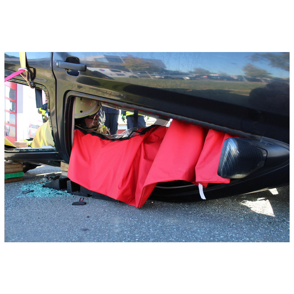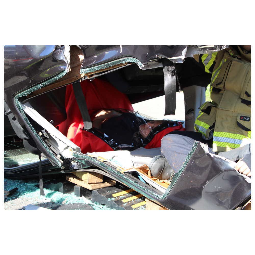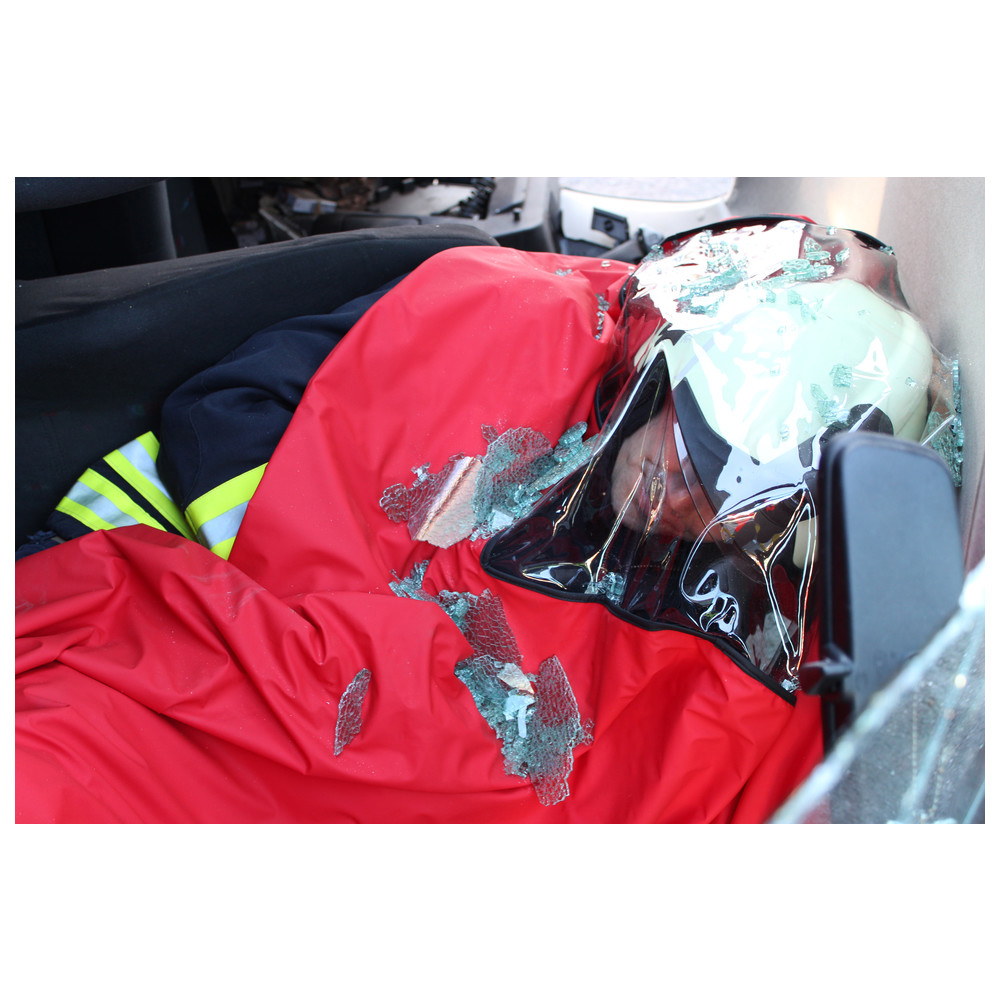 In traffic accidents, drivers or passengers are often trapped in a damaged vehicle.The D�nges patient-protection blanket protects the patient from glass dust, splinters, sparks, etc. when firefighter dismantle an accidented vehicle during a rescue operation.