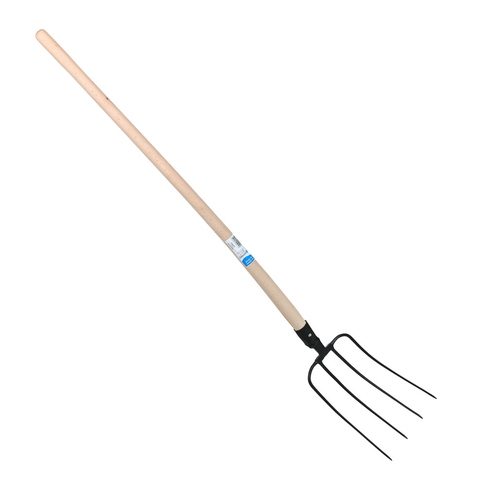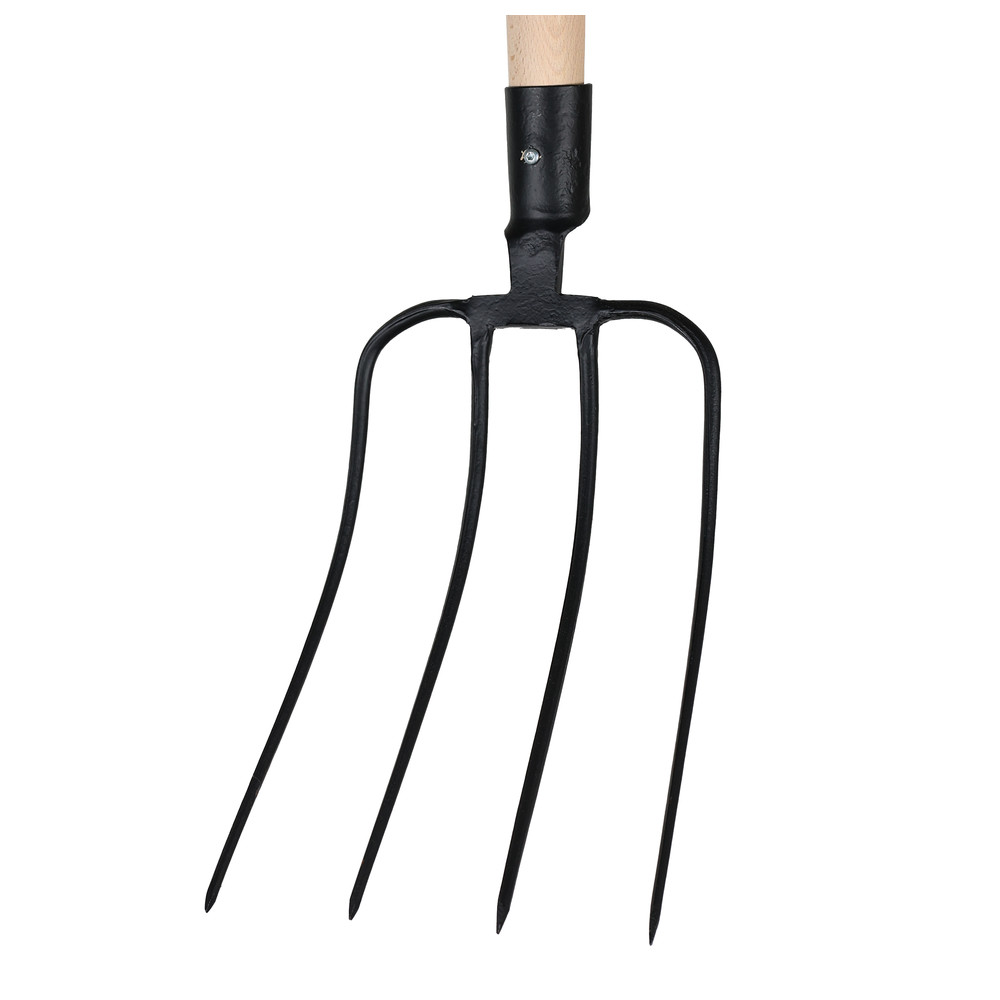 The Dönges manure fork with a length of 1,350 mm is a reliable and robust tool for all agricultural and gardening tasks. The black lacquered fork features four sturdy tines, perfect for picking up and moving manure and other materials. The curved long handle made from high-quality beech wood ensures comfortable and ergonomic handling. The handle is securely and firmly attached to the fork via a socket, ensuring high durability and stability.