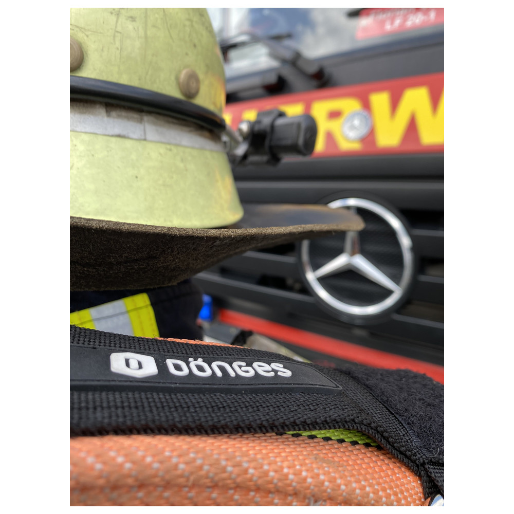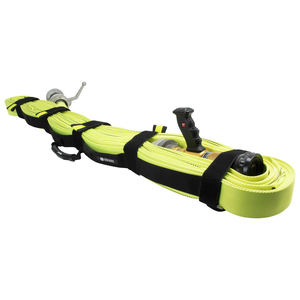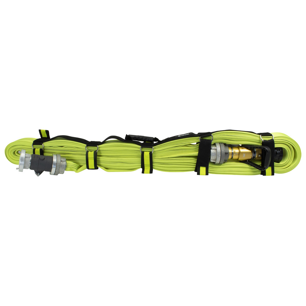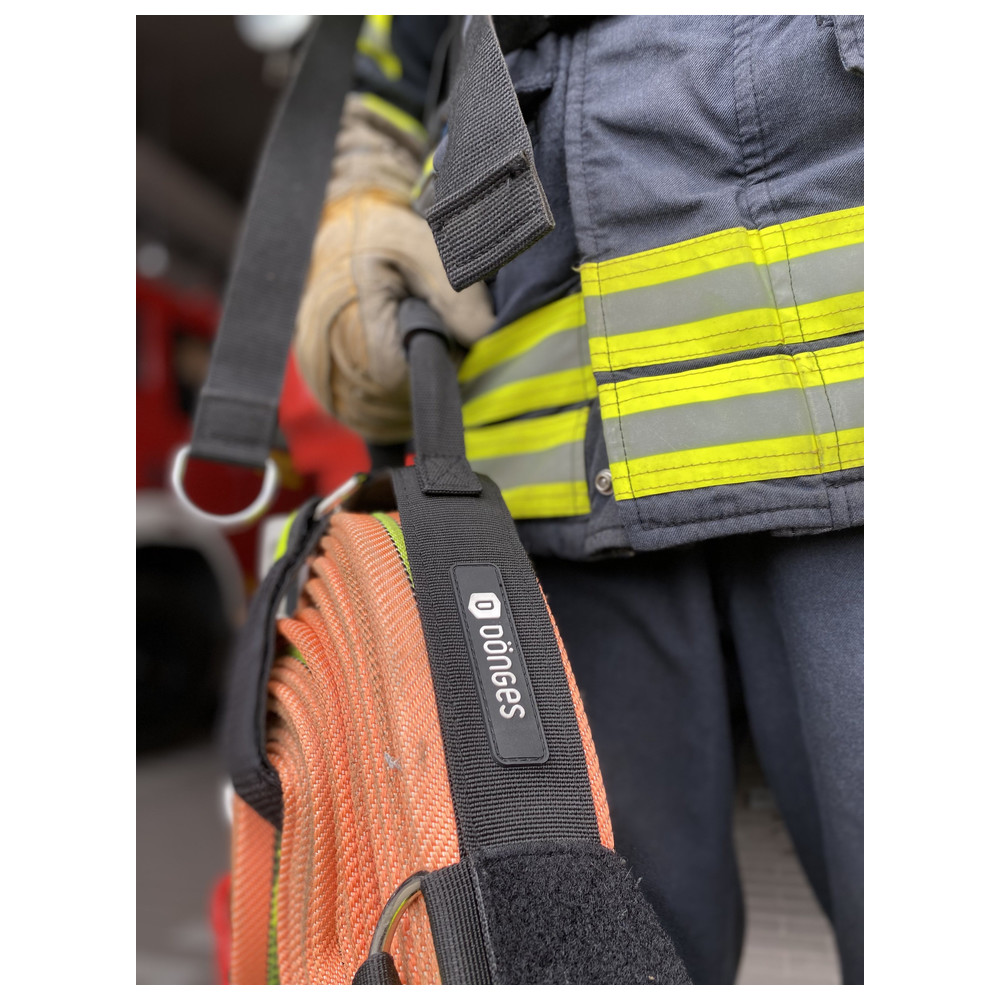 With the System II the Velcro tape can either be fed through the D-ring for permanent fixation, or the package can simply be wrapped with the Velcro. Due to the lower holding force during wrapping, the Velcro straps are released when pressure is applied to the hose. This supports a fast and easy hose laying whilst a fireman advances towards the fire.